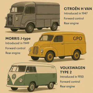 Forward control was the era’s magic trick. Put the driver over the axle, not behind it, and you carved cubic meters out of thin air. Loading heights fell; turning circles shrank; city access improved. A van should be a room that moves, not a car awkwardly dragging a shed. Postwar designers got the memo and underlined it twice.